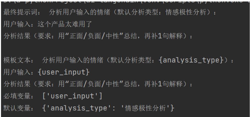运行效果预期: 最终提示词中,{analysis_type}会自动替换成“情感极性分析”,无需手动填: “分析用户输入的情绪(默认分析类型:情感极性分析):用户输入:这个产品太难用了分析结果(要求:用“正面/负面/中性”总结,再补1句解释):”