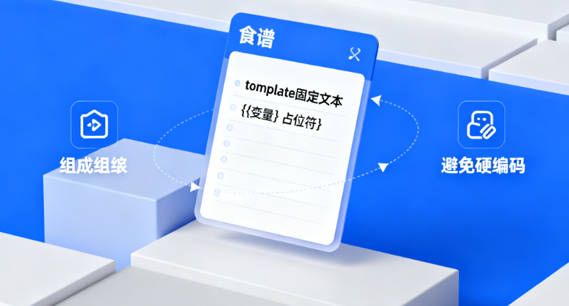 template | 菜谱框架(固定步骤) | 带占位符的文本,比如“为{product}写3个广告语” |