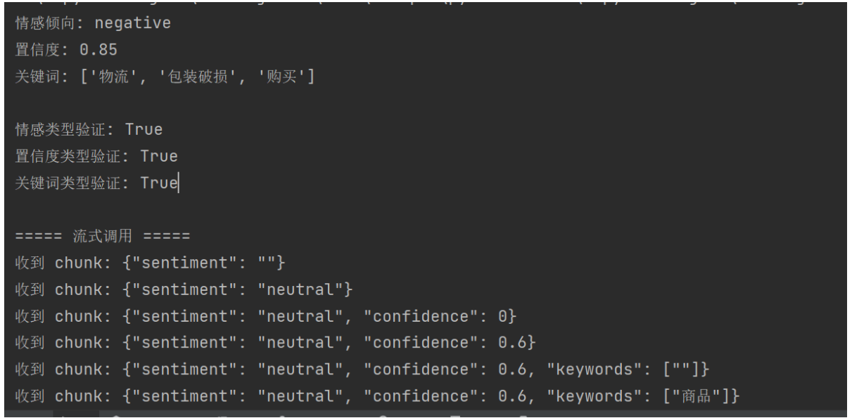 输出情感倾向: negative置信度: 0.85关键词: ['物流', '包装破损', '购买']情感类型验证: True置信度类型验证: True关键词类型验证: True===== 流式调用 =====收到 chunk: {"sentiment": ""}收到 chunk: {"sentiment": "neutral"}收到 chunk: {"sentiment": "neutral", "confidence": 0}收到 chunk: {"sentiment": "neutral", "confidence": 0.6}收到 chunk: {"sentiment": "neutral", "confidence": 0.6, "keywords": [""]}收到 chunk: {"sentiment": "neutral", "confidence": 0.6, "keywords": ["商品"]}收到 chunk: {"sentiment": "neutral", "confidence": 0.6, "keywords": ["商品质量"]}收到 chunk: {"sentiment": "neutral", "confidence": 0.6, "keywords": ["商品质量", ""]}收到 chunk: {"sentiment": "neutral", "confidence": 0.6, "keywords": ["商品质量", "不错"]}收到 chunk: {"sentiment": "neutral", "confidence": 0.6, "keywords": ["商品质量", "不错", ""]}收到 chunk: {"sentiment": "neutral", "confidence": 0.6, "keywords": ["商品质量", "不错", "价格"]}收到 chunk: {"sentiment": "neutral", "confidence": 0.6, "keywords": ["商品质量", "不错", "价格合理"]}收到 chunk: {"sentiment": "neutral", "confidence": 0.6, "keywords": ["商品质量", "不错", "价格合理", ""]}收到 chunk: {"sentiment": "neutral", "confidence": 0.6, "keywords": ["商品质量", "不错", "价格合理", "物流"]}收到 chunk: {"sentiment": "neutral", "confidence": 0.6, "keywords": ["商品质量", "不错", "价格合理", "物流", ""]}收到 chunk: {"sentiment": "neutral", "confidence": 0.6, "keywords": ["商品质量", "不错", "价格合理", "物流", "有点"]}收到 chunk: {"sentiment": "neutral", "confidence": 0.6, "keywords": ["商品质量", "不错", "价格合理", "物流", "有点慢"]}