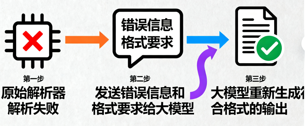 这种机制利用大模型自身的理解能力来修复其产生的格式问题,形成了一个闭环的纠错流程。