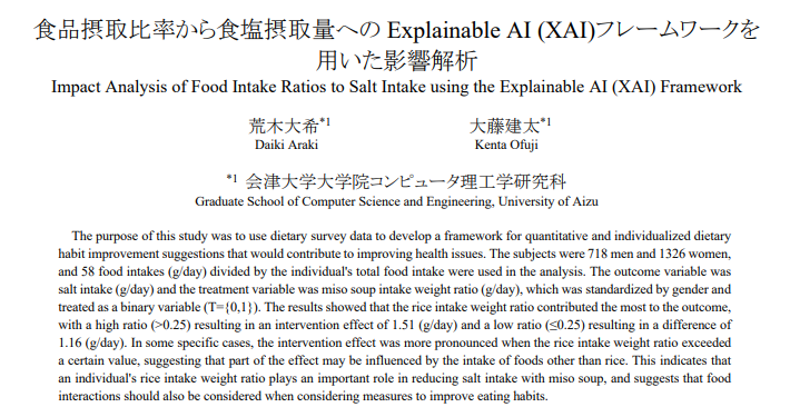 本文基于荒木大希与大藤建太的研究报告《食品摂取比率から食塩摂取量へのExplainable AI (XAI)フレームワークを用いた影響解析》展开探讨。该研究揭示,在全球范围内,减盐已成为食品行业和公共卫生领域的重要议题。报告中分析,日本福岛县的数据显示,当地居民的食盐摄入量、肥胖率及吸烟率均高于全国平均水平,这一现状促使相关部门积极推进减盐行动(福岛县保健福祉部,2024)。然而,传统的健康饮食建议往往采用“一刀切”的模式,难以适应个体化的饮食习惯差异。随着膳食调查数据的积累和人工智能技术的发展,基于数据的个性化营养分析正成为解决这一问题的可行路径。