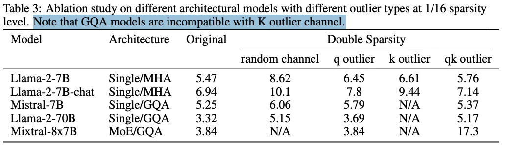 同时,为了验证 Double Sparsity 的鲁棒性和1/16稀疏度的有效性,在各种模型配置和条件下进行了一系列消融实验。下表展示了在1/16稀疏度下,Double Sparsity 在各种模型大小、注意力机制和MoE配置中的有效性。