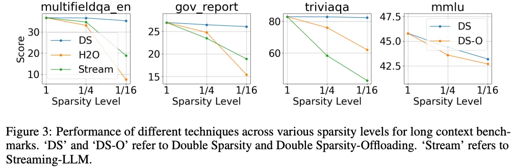 通过使用 Llama-2-7B 模型在多个长文本基准测试中评估了Double Sparsity技术在不同稀疏水平下的性能。下图展示了 Double Sparsity 在 1/16 的稀疏水平下能够保持性能几乎不下降,并且在准确性方面优于其他技术(StreamingLLM 和 H2O)。
