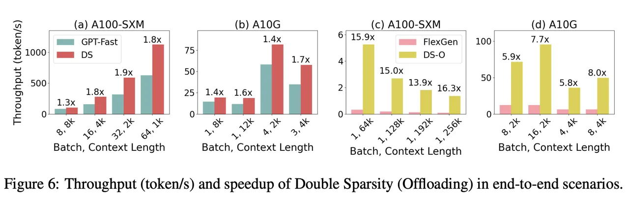 下图(c)(d)展示了在受限内存占用下,Double Sparsity-Offload 与 FlexGen 的吞吐量对比。两种技术均采用双缓冲区进行异步数据复制。结果表明,在常规工作负载下,Double Sparsity-Offload 实现了对 FlexGen 的 4 到 8 倍加速,在处理长文本(序列长度从 64K 到 256K)的场景下,加速比达到了 16 倍。