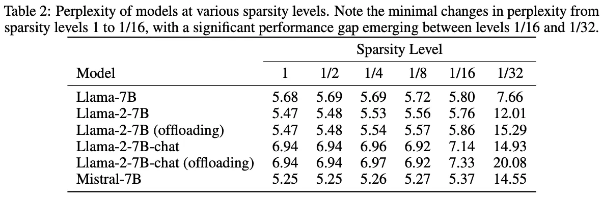 Wiki-2的困惑度是一个从维基百科文章中得出的基准,它提供了一个包含广泛词汇和真实文本特征的全面测试。分数越低,说明模型的表现越好。下表展示了每个模型在不同稀疏度水平下的困惑度变化。