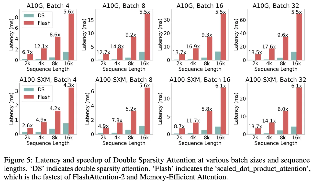 下图展示了在不同批量和序列长度下,Double Sparsity 与scaled_dot_product_attention (FA2)在延迟和加速方面的全面对比。在A10G GPU上,每种情况至少提速了五倍,超过一半的情况提速超过九倍。值得注意的是,Double Sparsity 在序列长度为4096且批量较大的情况下实现了线性加速。在A100 GPU上,几乎所有情况的处理速度至少提高了四倍,批量更大的甚至可以达到十倍。A10G上小批量加速更明显,可能是因为Triton内核的启动时间,当A100上的内核执行时间较短时,这个时间变得很重要。