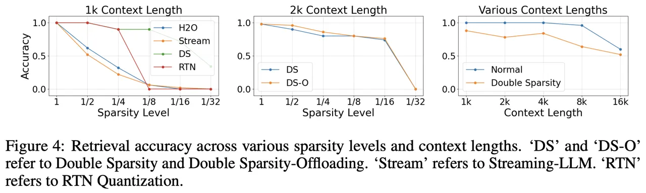 key-value 检索基准测试旨在评估模型的上下文检索能力,下图结果表明,Double Sparsity 在 key-value 检索任务中显著优于其他技术( H2O、StreamingLLM 和 RTN 量化)。值得注意的是,Double Sparsity和Double Sparsity-Offloading在性能上表现相当,这表明卸载机制几乎没有造成性能损失。