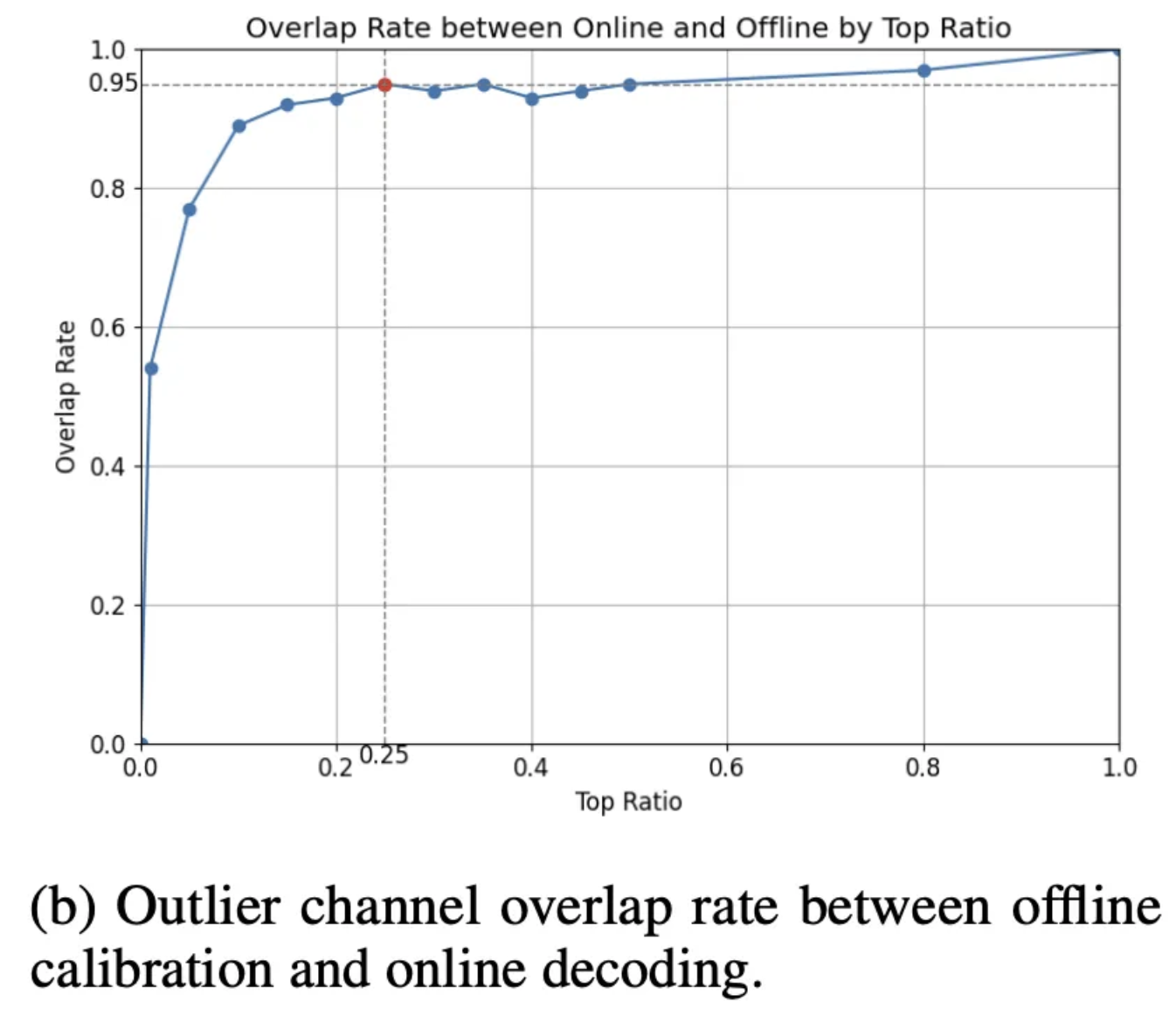 作者进行消融实验发现,当重要 Channel 的占比达到 0.25 时,通过离线方式确定的 Outlier Channel 与通过在线推理方式获得的 Outlier Channel 的重合度达到了 0.95。