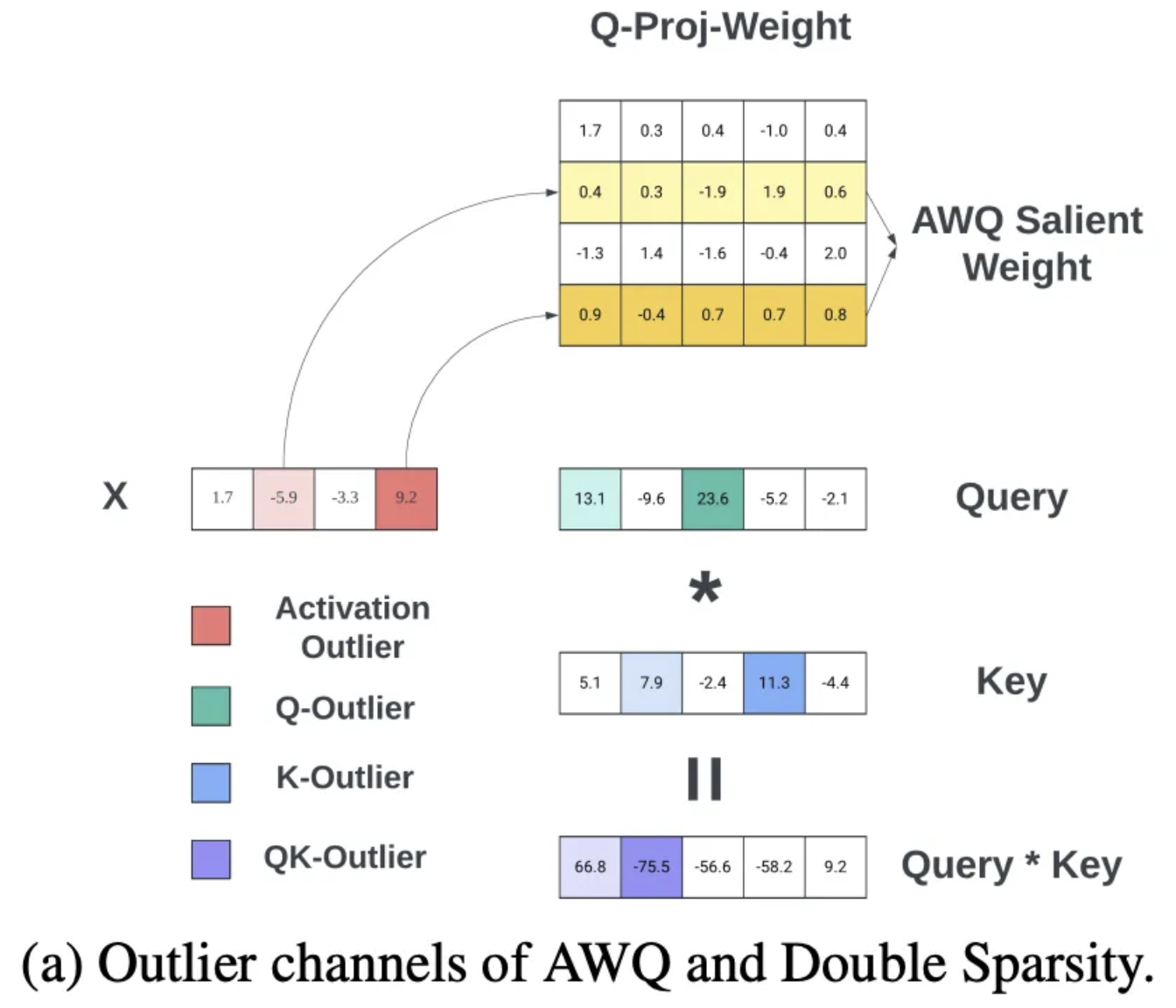 - QK-Outlier:根据 Query * Key 来识别重要 Channel,紫色部分。