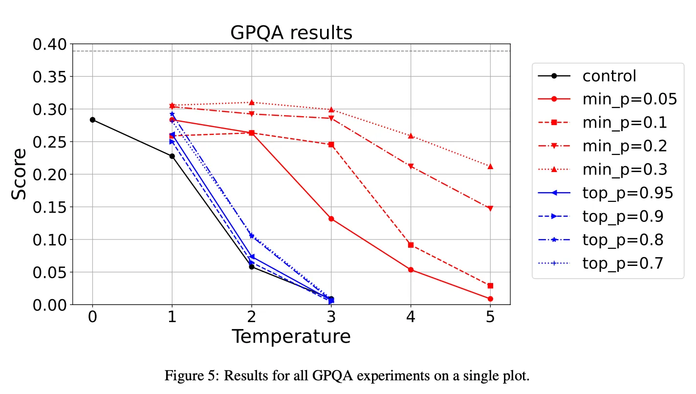 通过在多个大语言模型基准测试(包括推理 [GPQA]、小学数学 [GSM8K] 和创意写作 [AlpacaEval])上的实验,相比流行的 top-p 采样方法,min-p 在保持连贯性的同时,能够在温度(temperature)超过 1 的情况下生成更多样化的输出。而在标准温度设置()下,min-p 实现了与 top-p 相当的基准测试性能。