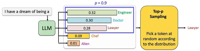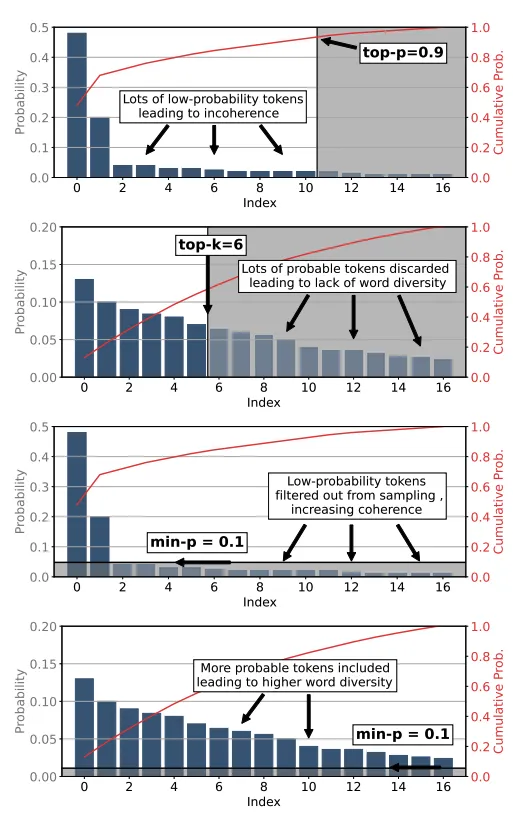 - 然后,温度(Temperature)仅用在筛选后幸存下来的合理候选者中,重新调整概率,在不重新引入不良候选者的情况下,微调最终选择似然。