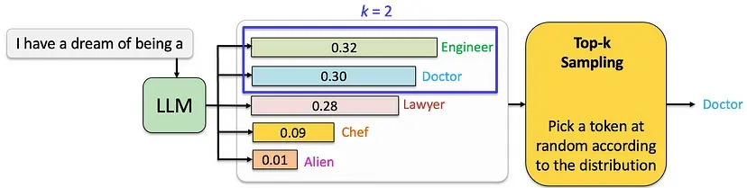 - 通过调整 (k) 的值,模型可以在创造性和连贯性之间取得平衡。例如,k = 1 等同于贪婪搜索,而 k = V(其中, V 是词汇表大小)等同于纯粹的随机采样。