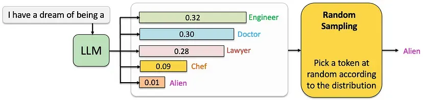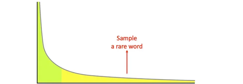 然而,纯粹的随机采样方法在概率分布的长尾部分存在显著缺陷,这也是LLM质量变差的区域。长尾指的是概率分布中模型为大量可能单词分配低概率的区域。虽然随机采样可以带来更多样的输出,但它也增加了从长尾中选择单词的可能性,这可能会导致文本毫无意义、语法错误或不连贯。
