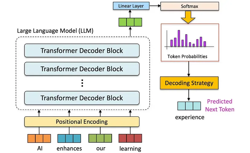 LLM生成是根据提示词以及之前生成的token生成下一个token的概率分布,之后通过不同解码策略来生成下一个token(词元)。