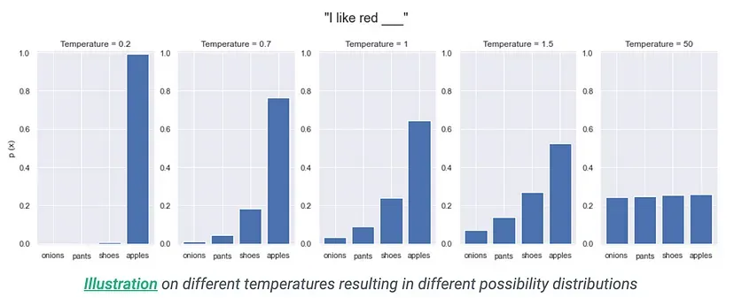 当 t > 1 时,模型变得更具创造性和多样性。温度越高,不太可能出现的单词被选中的可能性就越大,从而产生更多样、可能更令人惊讶的输出。在探索不同的生成结果或鼓励模型突破常规思考时,这一点特别有用。