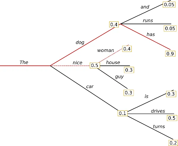 如下图所示,从单词 开始,算法在第一步选择条件概率最高的词 作为输出,依此往后。最终生成的单词序列为 ,其联合概率为 。