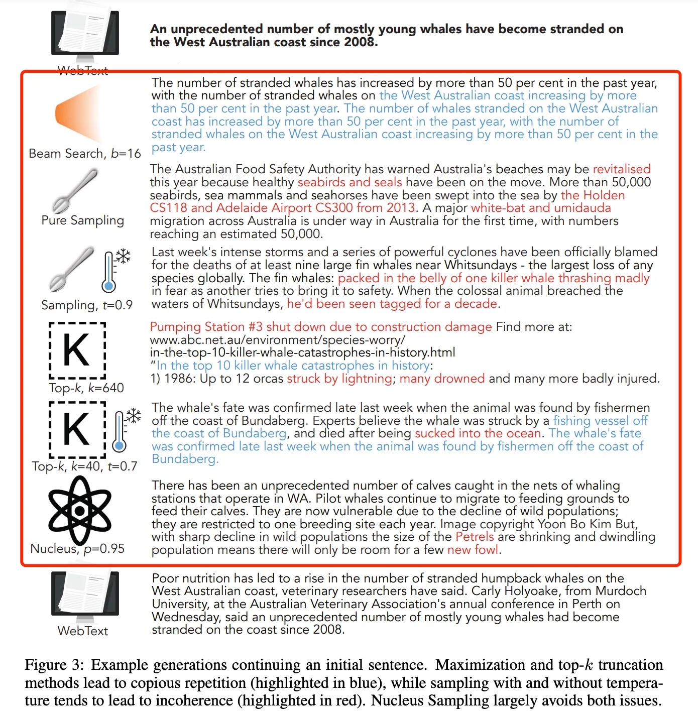 当使用LLM进行文本生成时,贪心搜索、束搜索 和 top-k 截断方法会导致大量的重复(用蓝色显示),而带温度和不带温度的采样往往会导致不连贯(用红色显示)。top-p采样(核采样)在很大程度上避免了这两个问题。