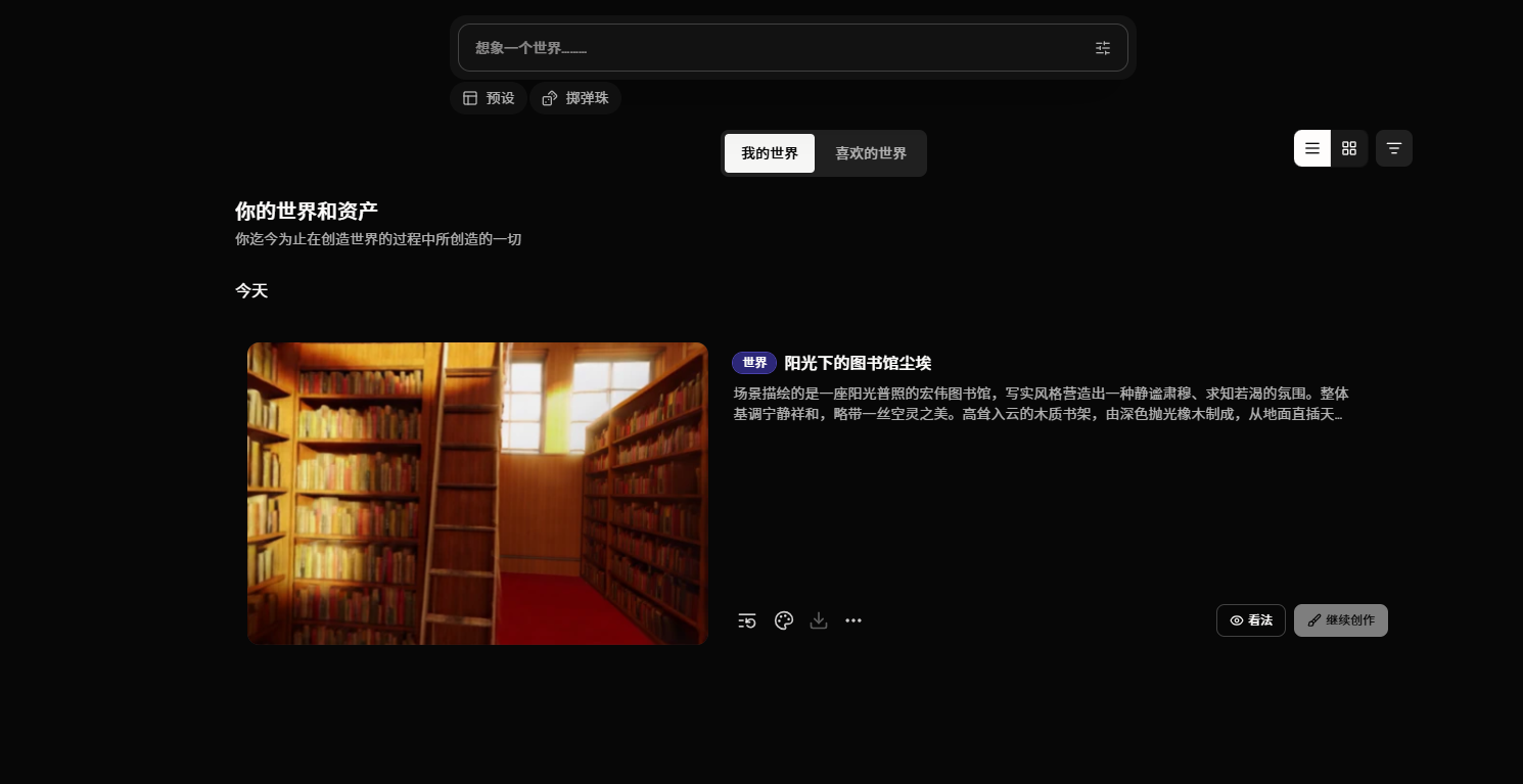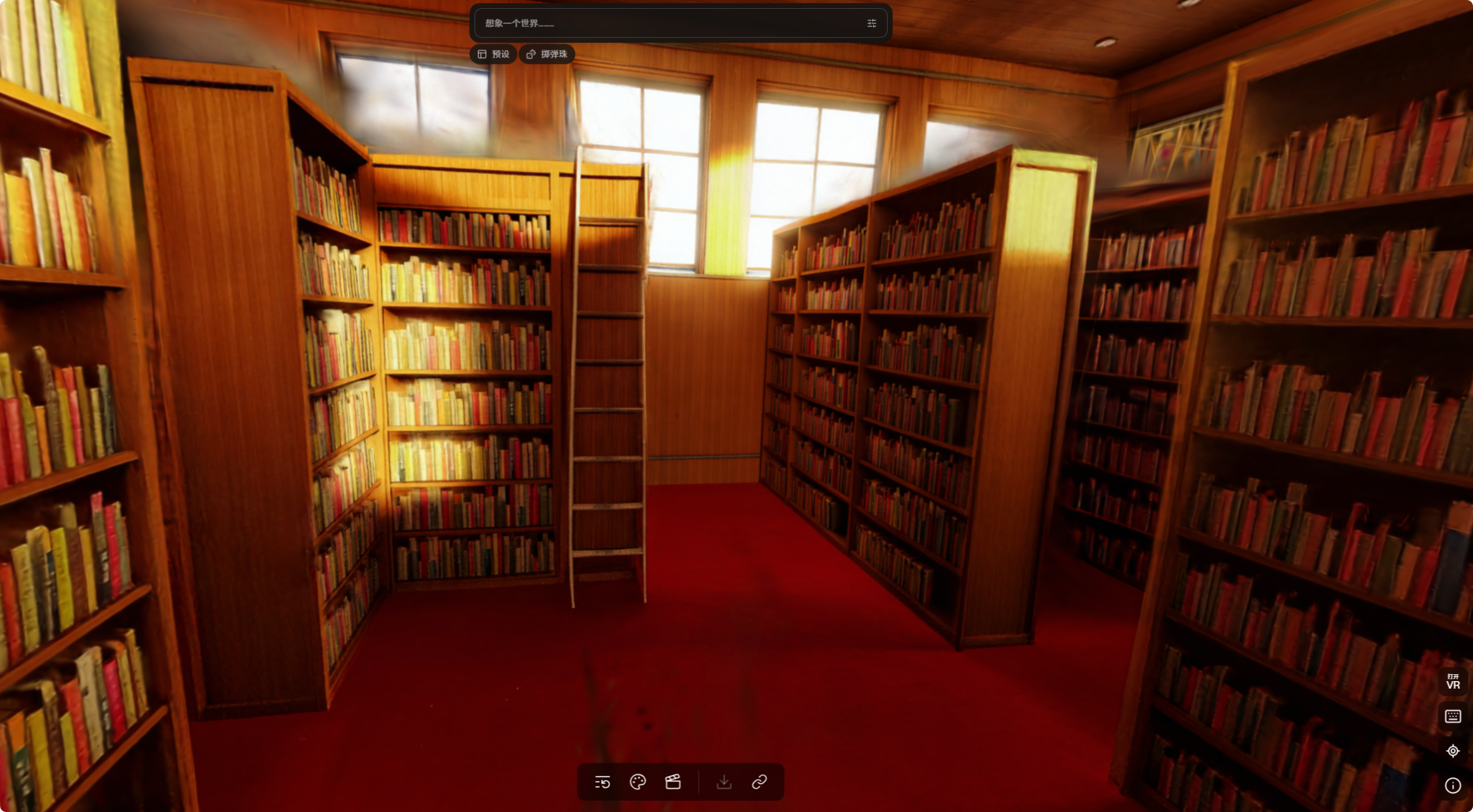 对新手用户而言,创作门槛被降到了最低:只需输入一段具象化文本描述,比如"午后阳光透过落地窗洒进图书馆,高耸至天花板的书架摆满书籍,空气中浮动着细小的尘埃",Marble就能生成对应的3D场景,细节丰富且氛围到位。