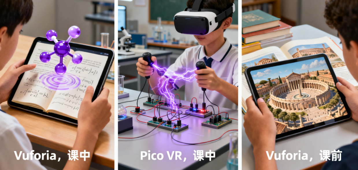工具选型:主流品牌入门级VR设备(如Pico 4、Quest 2等,需根据预算和可用性选择)+ SteamVR插件+ Unity开发的物理实验场景(可从北师大等机构的教育技术开源资源平台获取)。
