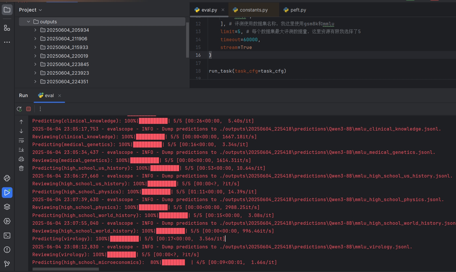 2.同样的在项目目录中新建eval.py文件,写入如下代码(如果直接执行有依赖报错可以在环境中执行pip install 'evalscope[all]')