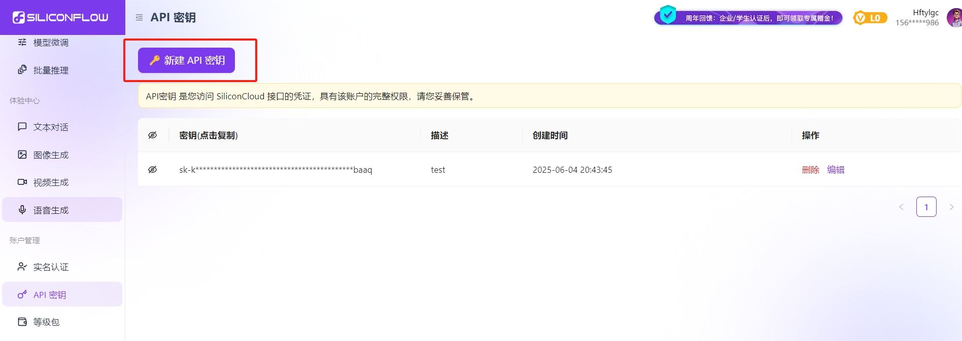 2. 点击左边栏API密钥, 新建API 密钥用于请求大模型: