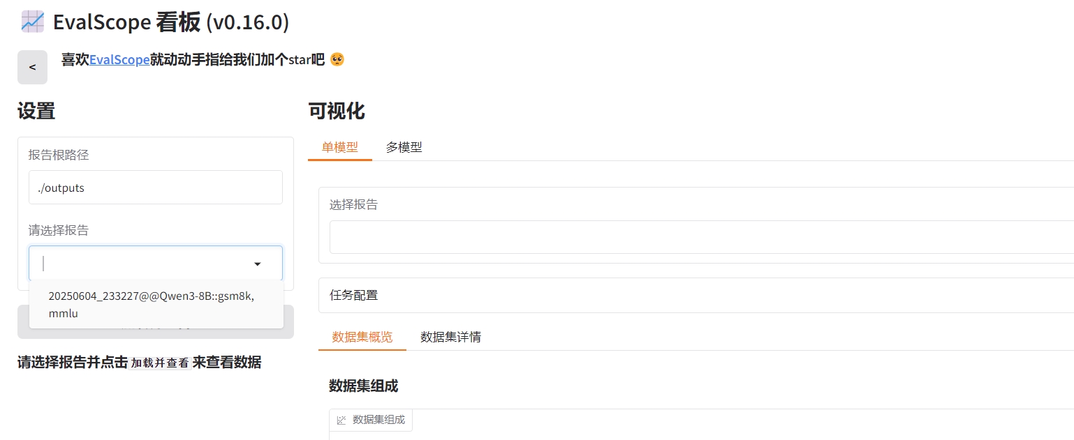 4. 执行完成后我们还可以利用evalscope的app功能可视化执行结果,在outputs的父级目录中打开命令行,输入命令evalscope app, 默认会在http://localhost:7860打开可视化界面,如下图选择我们的报告,点击加载并查看: