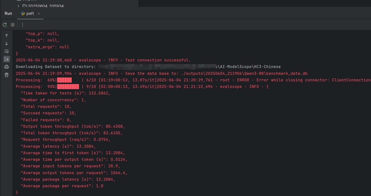 5.执行以上代码后,Evalscope首先会从modelscope下载数据集到本地,然后从中筛选100条并发请求硅基流动的Qwen3-8B模型。