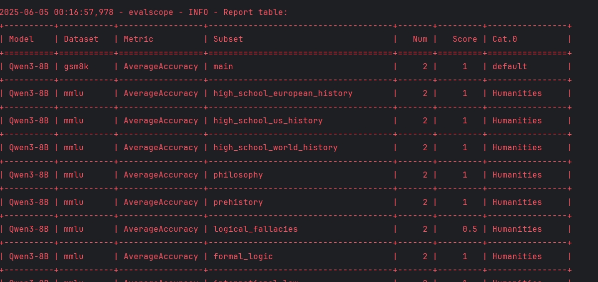 3.执行结果如下图所示,注意因为mmlu包含很多子类(一共57个子类),每个子类都会抽取2条进行评测,所以需要的时间较长。执行完成后日志中会打印每个数据集的得分,得分为1表示随机挑选的两个问题全部预测正确,0.5表示只预测正确两个中的一个,0表示两个都没预测对。完成后的结果同样保存在outputs文件夹中。