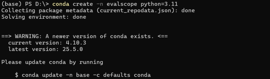 - 为避免与其它环境冲突,我们同样使用anaconda创建虚拟环境来安装EvalScope, 执行如下命令: