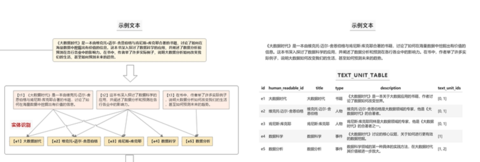 - GraphRAG需要处理一大篇文档或语料库,首先它会将这些文档切分为Text Units (文本单元),这些Text Units是输入文档的切片,通常由段落、句子或固定长度文本块切分而来。