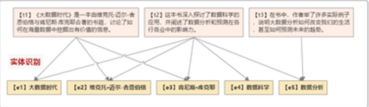 表中各列id和humanreadableid表示实体编号,title表示实体名称,type表示实体类别,description表示实体的描述。text_unit_ids表示实体出现在哪些文本块中,这样就把实体和文本块连接起来,所有这些连接关系在之后知识图谱的查询中都会用到。实体识别流程以图形式表示如下: