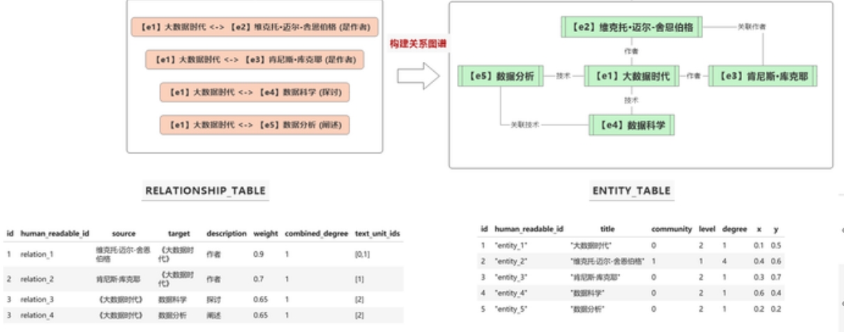 - 通过关系抽取,GraphRAG可以构建关系表和实体关系表,这两个表将有助于后续的查询引擎理解和推理。