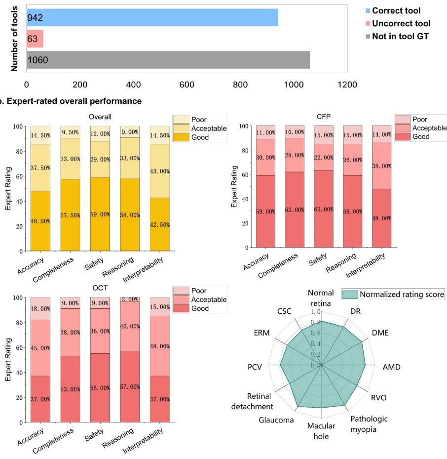 虽然系统仍有局限,其性能在眼底彩照(CFP)模态最强,OCT工具尚待丰富,LLM推理逻辑也未必完全契合眼科专科思维。