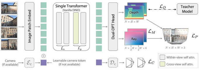 2. 输入自适应的跨视角注意力机制:Transformer层分为两组——初始层($L_s$)在各图像内独立应用自注意力,后续层($L_g$)通过动态重排输入标记,在跨视角和视角内注意力之间交替。这种设计自然地适应不同的输入场景。