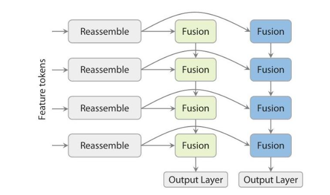 3. 双DPT预测头:特征通过共享的重组装模块后,分流到两个独立的融合层集合——一个优化用于深度预测,另一个用于射线预测,最后通过独立的输出层生成结果。