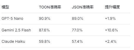 在多模型基准中,TOON展现出卓越的准确性和效率平衡: