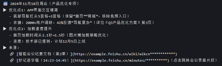 - 提问 “周会上发布会的演讲和展示时间”,系统会检索智能会议纪要,返回 “演讲 5 分钟 + 展示 2 分钟” 的时间安排,并标注来源为 “11 月 18 日发布会筹备周会文档”。