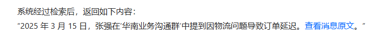 我们输入 “之前谁在群里说过华南地区订单延迟的事情”,系统会自动检索用户所在群聊的历史消息,匹配包含 “华南地区”“订单延迟” 相关语义的内容,返回类似 “2025 年 3 月 15 日,张强在‘华南业务沟通群’中提到因物流问题导致订单延迟” 的结果,并附上消息链接。