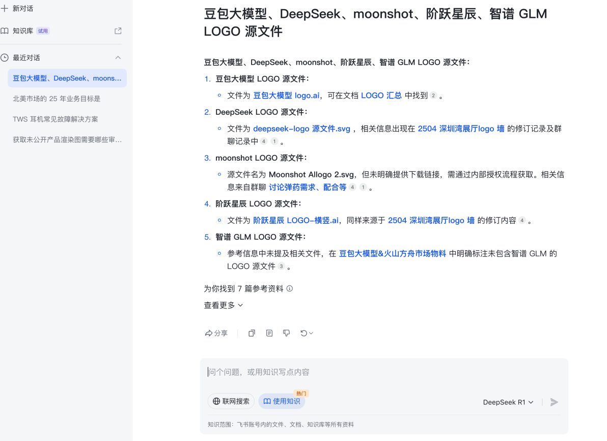我们只需以日常对话方式提问,系统即可自动检索权限范围内的文档、群聊、会议纪要等内容,生成结构化答案并标注来源。比如我们可通过提问 “xx文件”,快速获取历史文档和聊天记录中的关键信息,将原本 30 分钟的检索工作缩短至 30 秒。系统支持 “深度思考” 模式,进行问题理解和资料检索。
