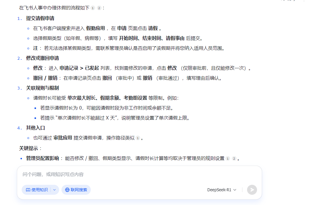 - 我们可直接提问获取制度流程,系统自动检索飞书内权限范围内的文档、群聊、会议纪要等,生成图文、流程的答案。