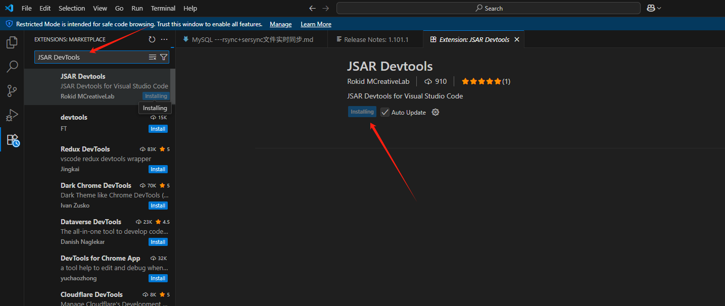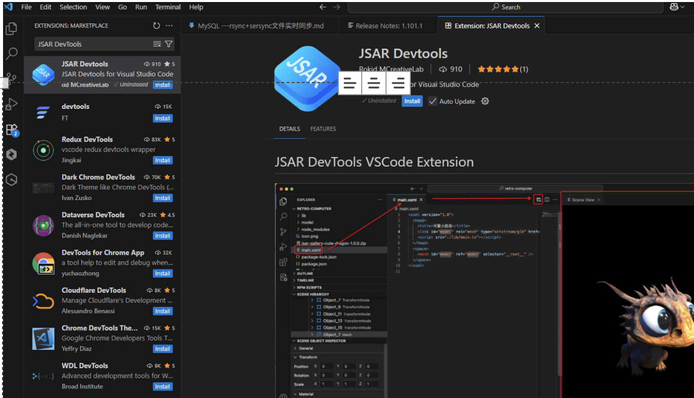 - 在搜索框输入“JSAR DevTools”,找到由“Rokid MCreativeLab”开发的插件。