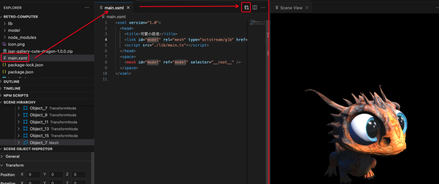 main.xsml的标签页,右上角会出现“打开场景视图”按钮(类似眼睛图标),点击该按钮。 - 此时会弹出“Scene View”窗口,自动加载场景中的 3D 模型和交互逻辑。