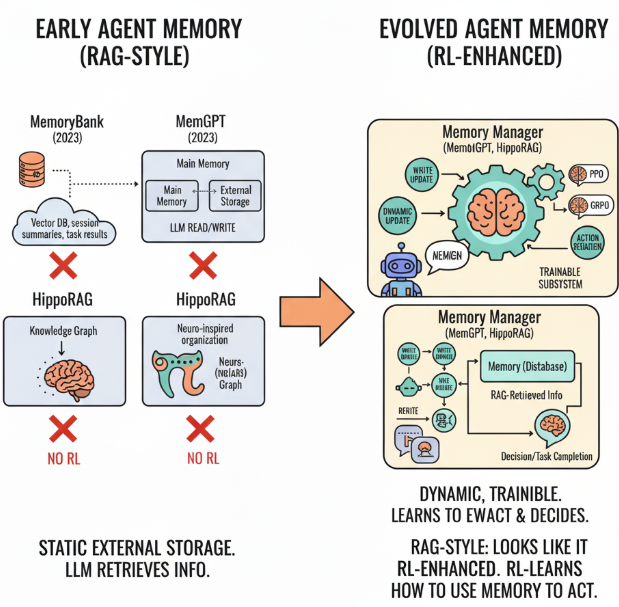 🤖 而早期的Agent中Memory模块(MemoryBank, MemGPT , and Hip-poRAG)不仅仅是记忆外部的缓存,他是参与了整个决策过程的模块。记忆的内容会被动态更新,决定记忆信息的记忆和遗忘,并且影响着Agent决策的过程。