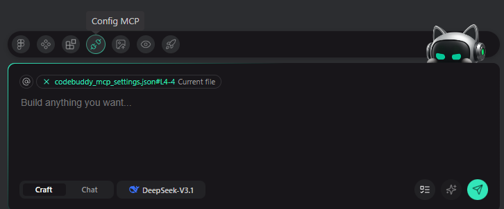 2️⃣ 按理来说接着应该是建立起mcp客户端与服务端进行通信连接,但是这些操作已经集成在了coding agent中,我们只需要告诉coding agent我们的服务路径即可。以CodeBuddy为例,我们可以先点击Config MCP来配置我们的服务信息,这一点和function Calling很像,我们也需要告诉大模型我们有了什么功能函数,不同的是,在这里所有的参数都是标准化的。
