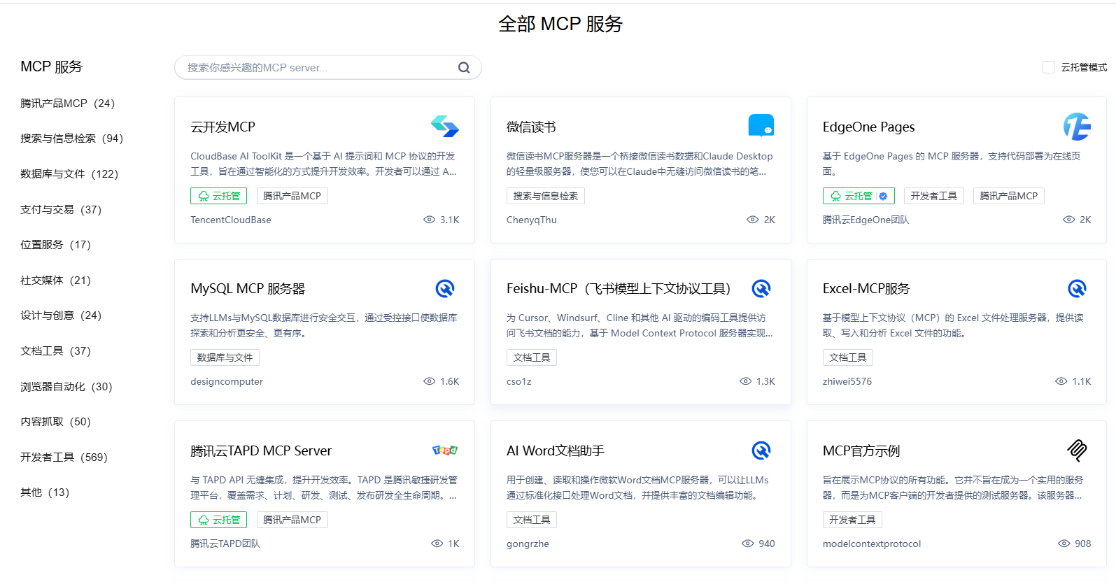 在上一章节中我们已经自己实现了本地服务的建立,但是,面对用户不断更新的需求,有些服务过于复杂,我们通过本地服务很难实现。因此,为了解决这一痛点,腾讯MCP广场提供了大量的MCP服务应用。可以发现,其中有AI Word文档助手,微信读书,MySQL等。