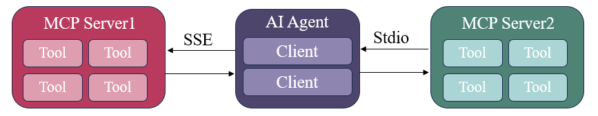 MCP与Function Calling相同,连接了AI应用以及工具类。通过统一的接入方式(通信协议)实现连接。每个MCP client(可以理解未AI应用的对象)都对应了一个MCP server。应用在调用方法类时主要有两种形式的调用:① 本地服务调用(Stdio协议) ② 远程服务调用(Http + SSE)