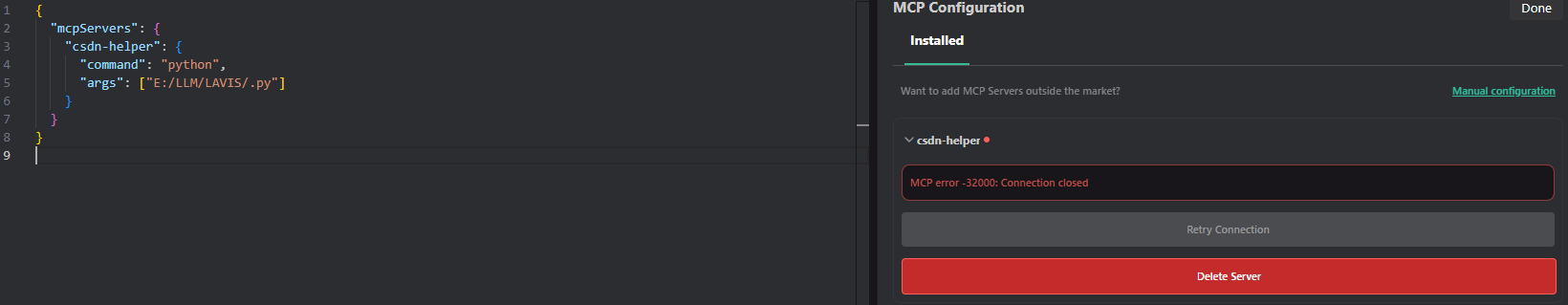 command修改为我们虚拟环境的python运行解释器,结果如图所示,可以发现已经成功连接!至此,我们就可以去建立自己的mcp本地服务了。