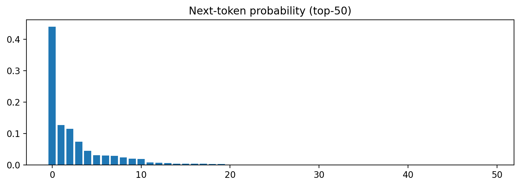 Top-k:只在概率最高的 k 个词中挑。Top-p(核采样):动态选择累计概率 ≤ p 的候选,更自然。- 频率惩罚(