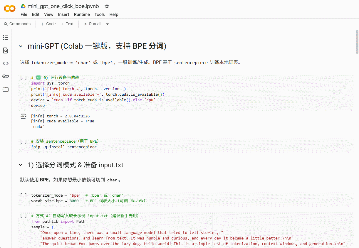 如果你不想从零复制粘贴代码,或者想直接体验完整的 mini-GPT 实现,我已经准备了一份 Google Colab Notebook:
