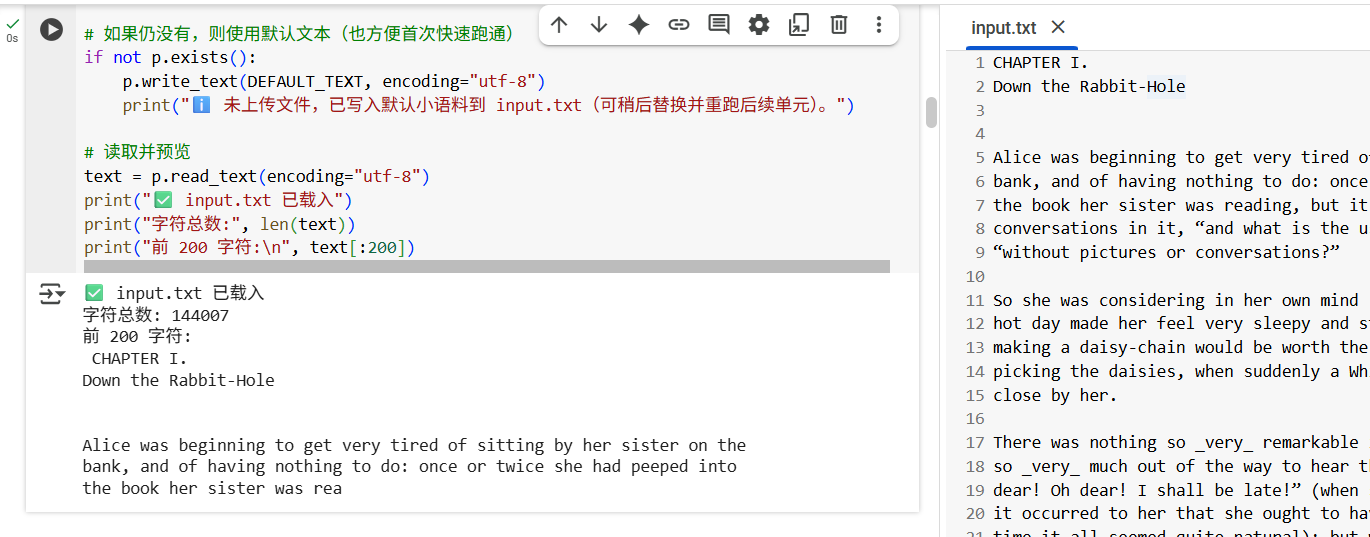 运行后会打印语料长度和前 200 个字符,方便确认文件读取成功。